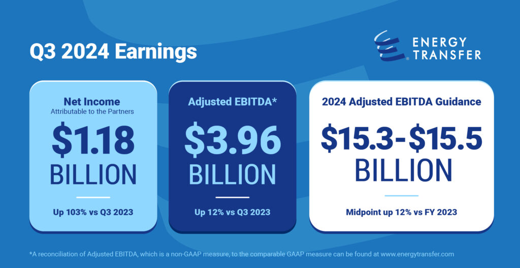 - Energy Transfer reported net income of $1.18 billion compared to $584 million for the third quarter of last year.
