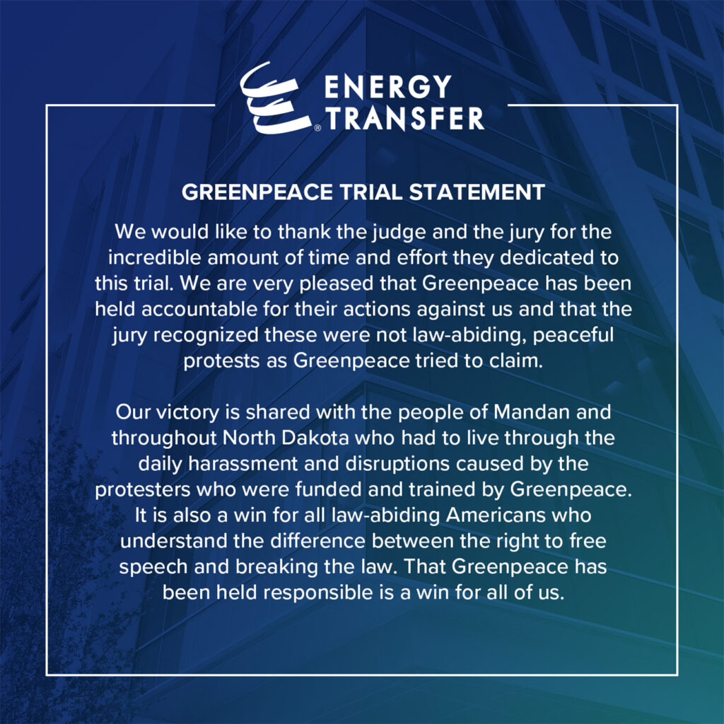Our victory is shared with the people of Mandan and throughout North Dakota who had to live through the daily harassment and disruptions caused by the protesters who were funded and trained by Greenpeace. It is also a win for all the law-abiding Americans who understand the difference between the right to free speech and breaking the law. That Greenpeace has been held responsible is a win for all of us.